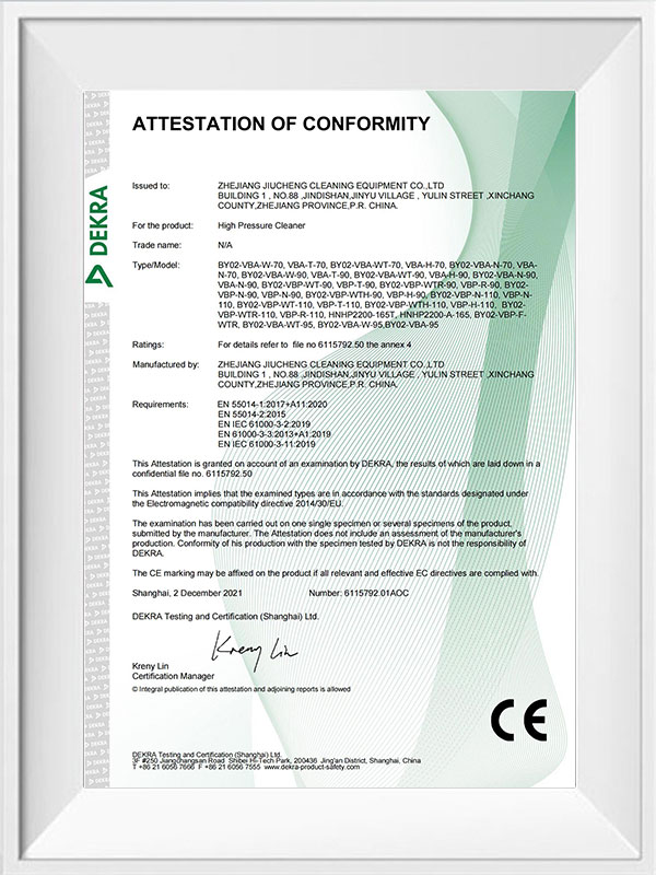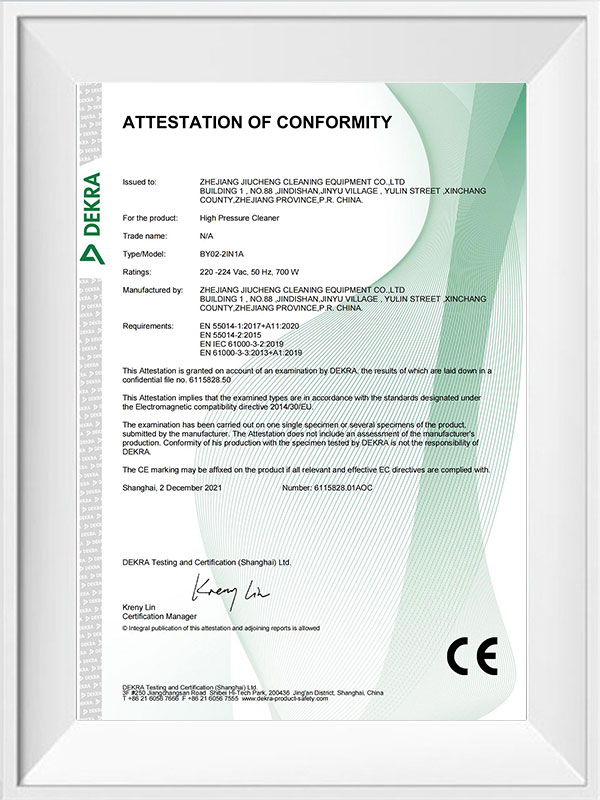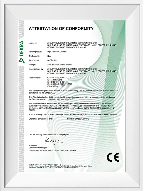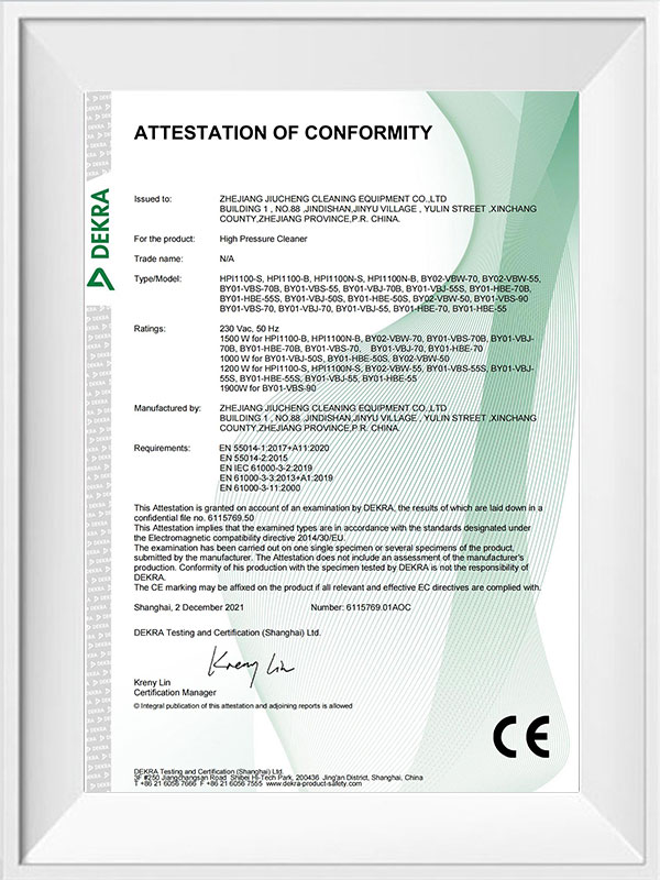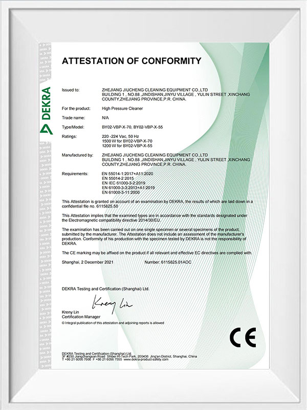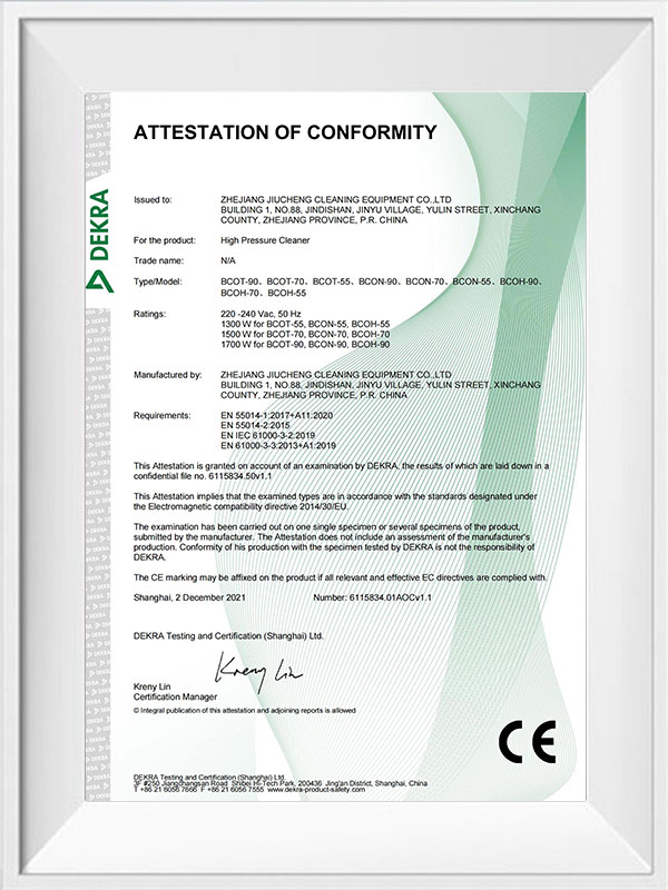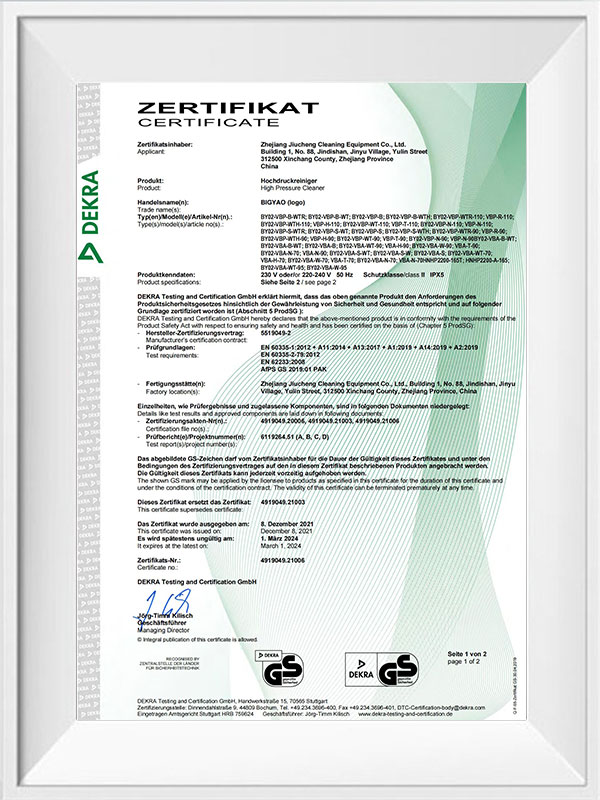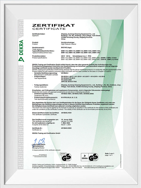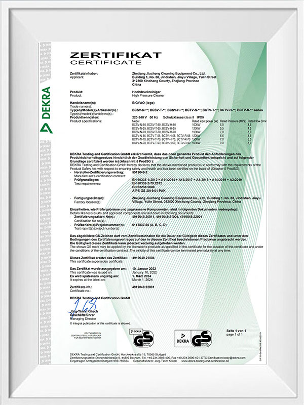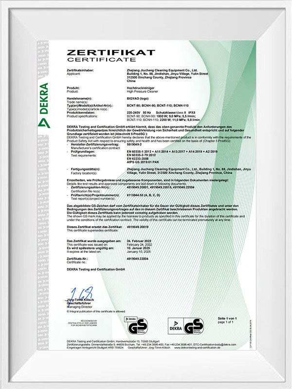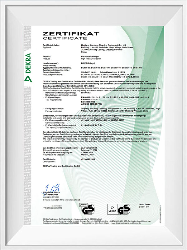 With nearly 30 years of experiences, Jiucheng Cleaning engaged in business of ODM and supplying products of self-brand Bigyao. We have modernization industrial production line , precise quality control system, and strong team working spirit. Our pump with double sealing system have been proved to improve efficiency to 3-5 times compared with similar products. So we are highly recognized and reputable by global customers. Our sale network covers more than 60 countries and regions in Europe, North America, South America, Southeast Asia and the Middle East etc. Our company are ISO9001 quality system certificated. And the series of high pressure washer products passed European Community CE/EMC/ETL/ROHS certification, American ETL/UL and German GS certification. We have good reputation for benefiting customers as a trustworthy and reliable business partner. We appreciate your contact and we would like to develop a good long-term partnership with you.